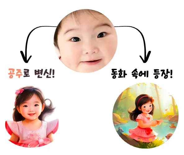 아이와 똑닮은 캐릭터가 동화 속에 등장할 뿐만 아니라, 아이의 상상력을 동화로 만들어줄 수도 있죠!